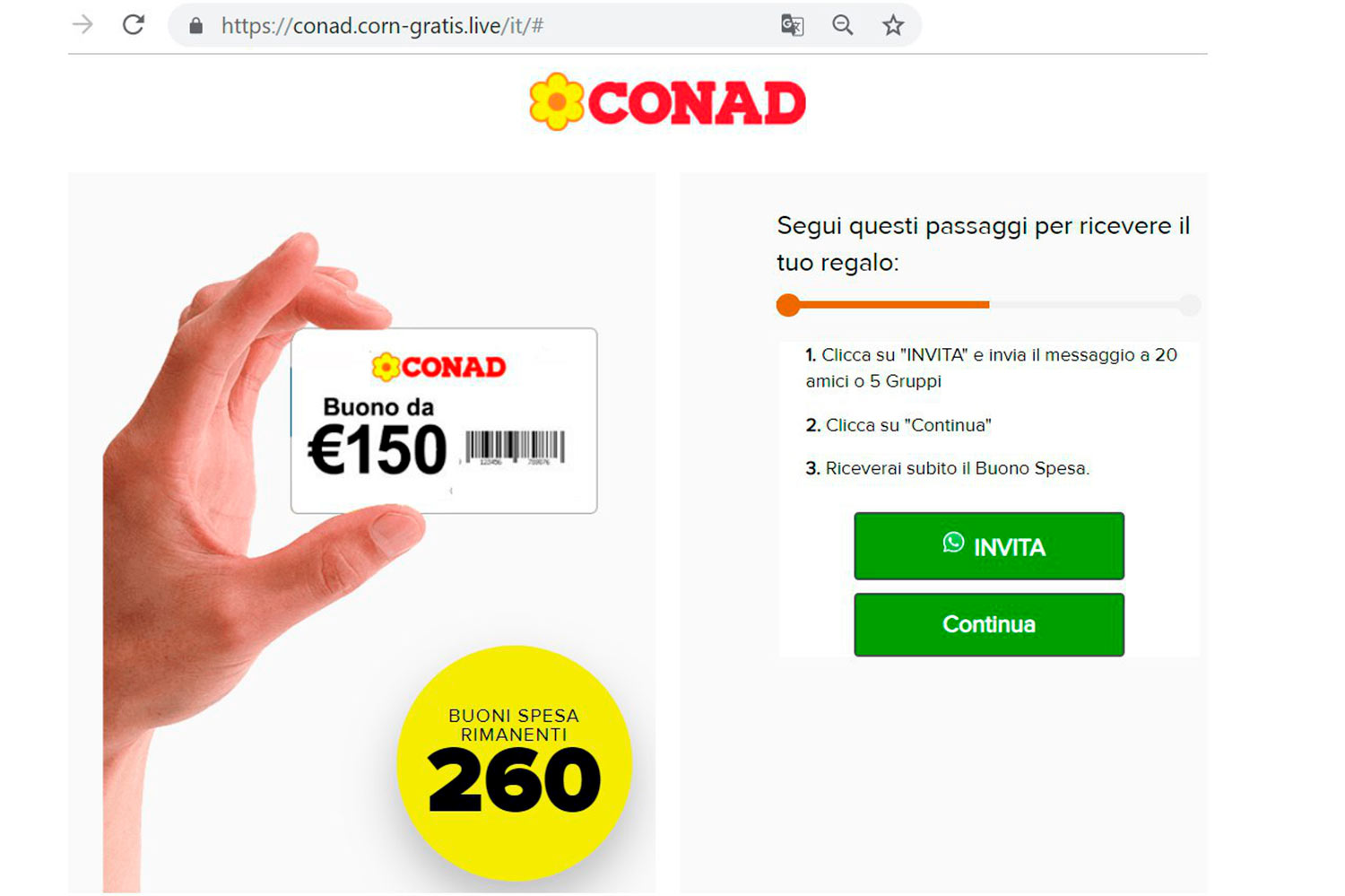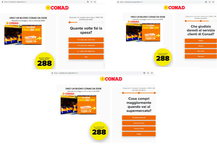 Fig. 1 Fake page (https://conad.corn-gratis[.]live/it/#) disguised as a legitimate Conad website. And the following questions are asked: “How often do you go to the supermarket?”, “How would you rate Conad’s customer service?”, “What do you buy when you go to the supermarket?”