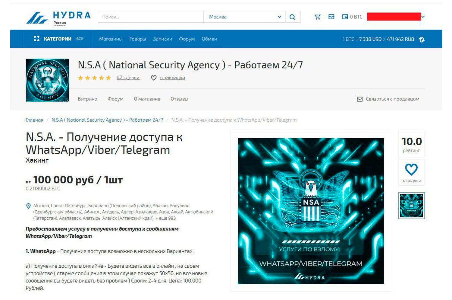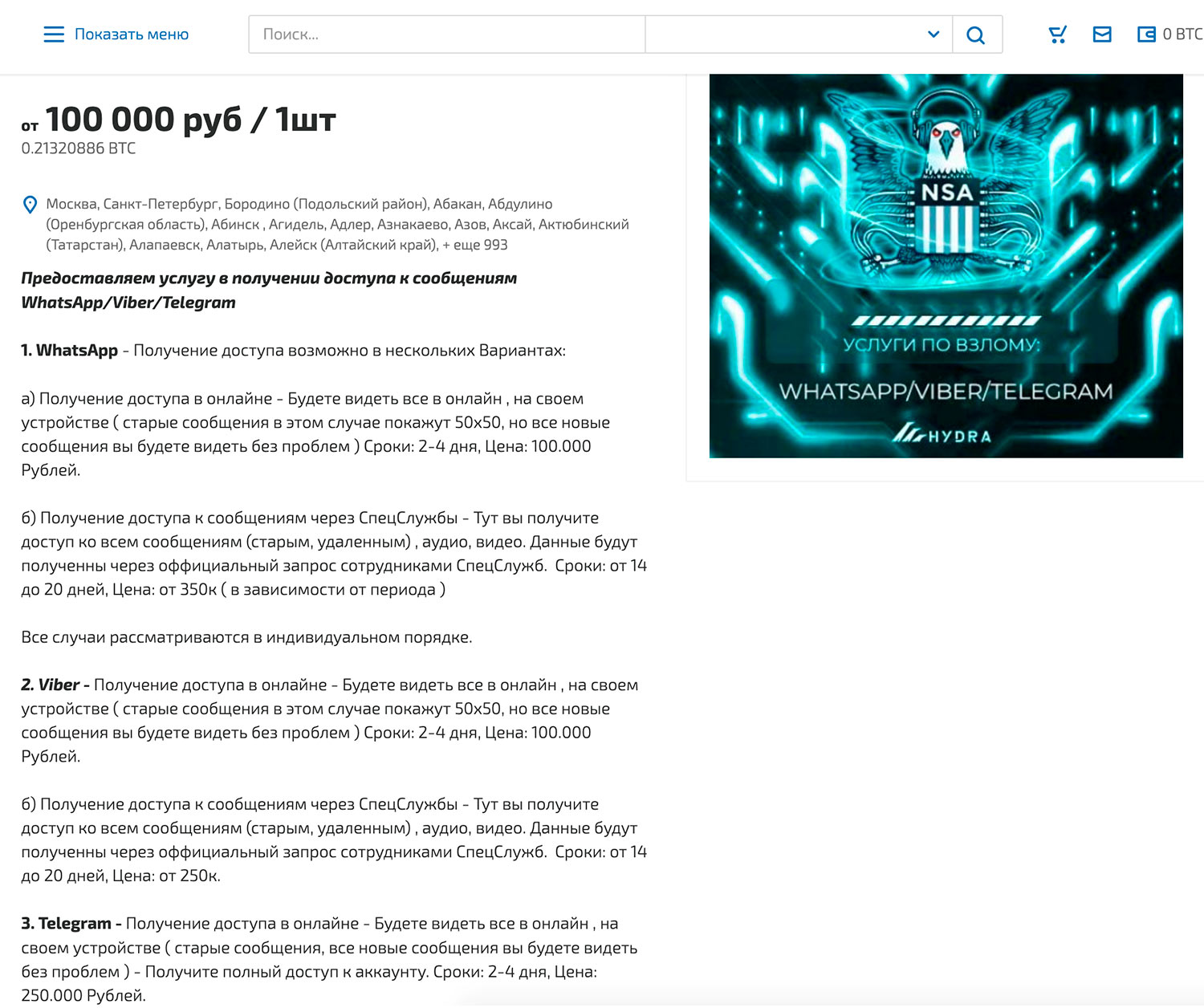 The ads published on Hydra underground forum, in particular, offered to buy access to WhatsApp, Viber or Telegram messengers. To get access to one’s WhatsApp or Viber account, two options were offered – an “online” one, which would allegedly show all the new messages on the device of the “service” buyer in real time, and an “advanced” one, which would reportedly grant access to the chat history with all the media files, including deleted ones. The price for the access to a WhatsApp account ranges between $1,550 and $5,450, while the access to a Viber account can be purchased for $1,550-3,900. For “stealing” a Telegram account, only one option – giving the full access to the account – was offered at $3,900 price.