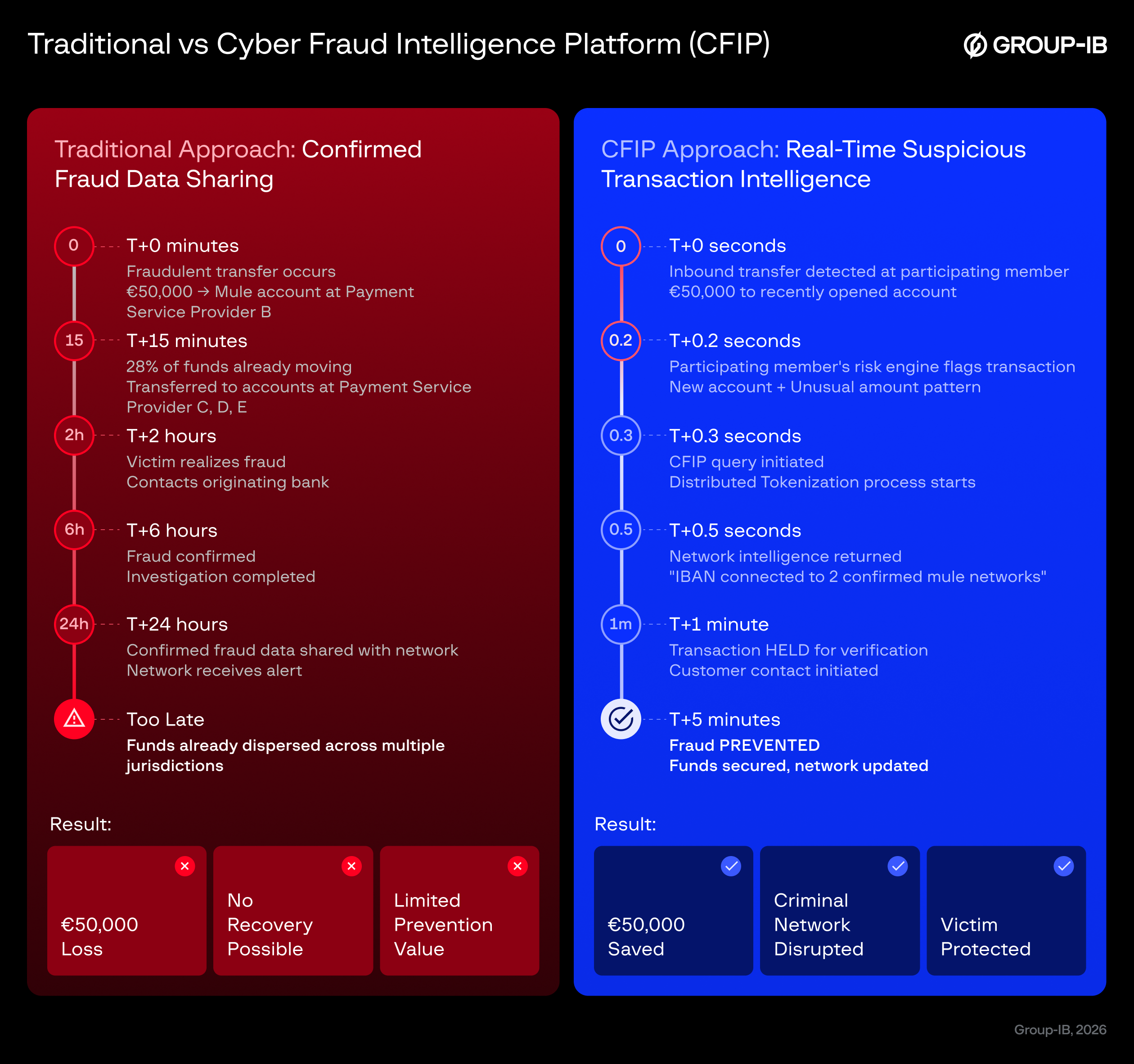Group-IB’s Cyber Fraud Intelligence Platform (CFIP) is a privacy-first collaborative intelligence platform that enables financial institutions to share both confirmed fraud data and suspicious activity signals in real-time — addressing the critical gap between regulatory mandates and operational capability. Operating as a governed network, Cyber Fraud Intelligence Platform functions as an intelligence layer that integrates with each institution’s existing fraud prevention systems, enriching their risk engines with collective intelligence without replacing current infrastructure. Early deployments have demonstrated measurable results: in one pilot with 46 participating banks and payment providers, institutions conducting real-time checks prevented an estimated $10–15 million in fraud annually, with projections reaching $100–300 million at full network participation. The platform’s technical foundation — Distributed Tokenization — ensures this collaboration happens while maintaining full GDPR compliance.