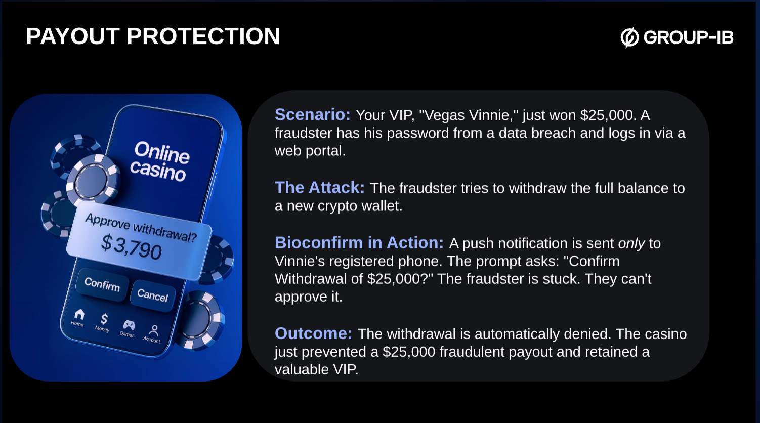 Group-IB recently introduced a concrete solution to the problem– BioConfirm for iGaming, which is an advanced authentication feature designed to deliver robust, user-friendly security in high-stakes fraud scenarios.