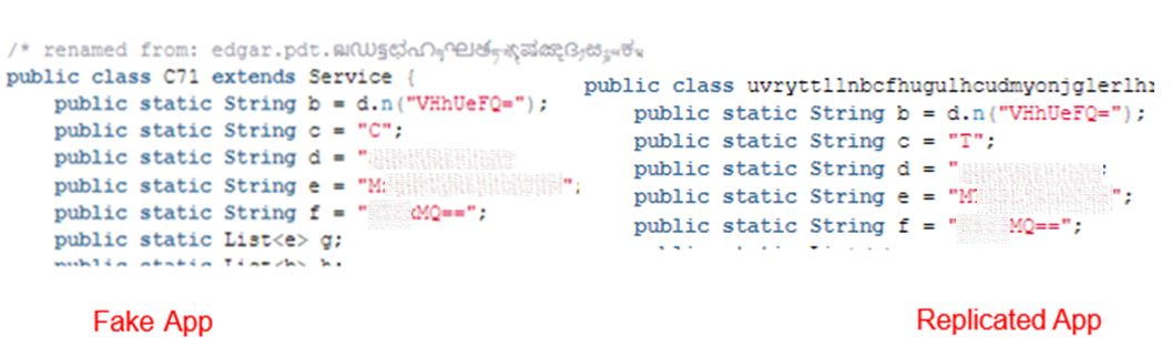 Figure 5. Comparing source code of fake app and a replicated app built using Craxs Rat builder.
