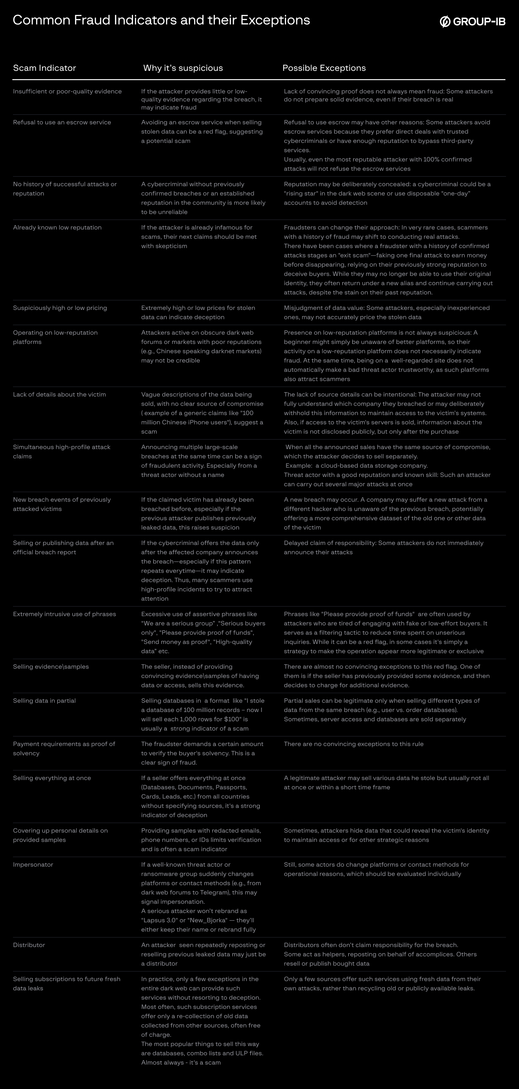 Even cybercriminals with a solid reputation, a history of confirmed attacks, sales, or leaks can still intentionally resort to deception—particularly in “Exitscams” where they disappear after a final, high value scam. Others may misrepresent recycled or misattributed data or access. That’s why, each case must be analyzed individually in a context, with careful eye on how many red flags show up. The more indicators present, the more confident we can conduct preliminary conclusions that a scam exists about any breach claim, and in some cases give 100% certainty that the attacker is a fraudster – without examining any evidence.