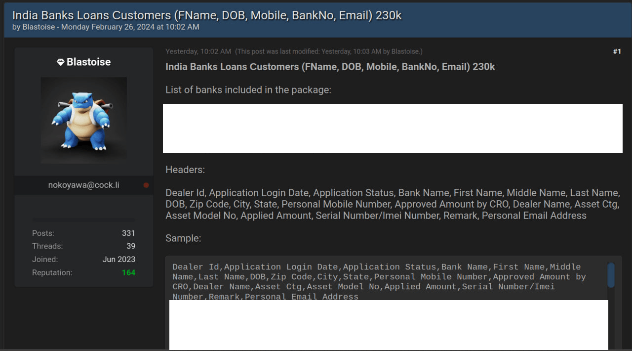 The attacker “B*****7” repackaged existing public data with fabricated banking information in an attempt to deceive buyers. Group-IB confirmed this dataset was not authentic.