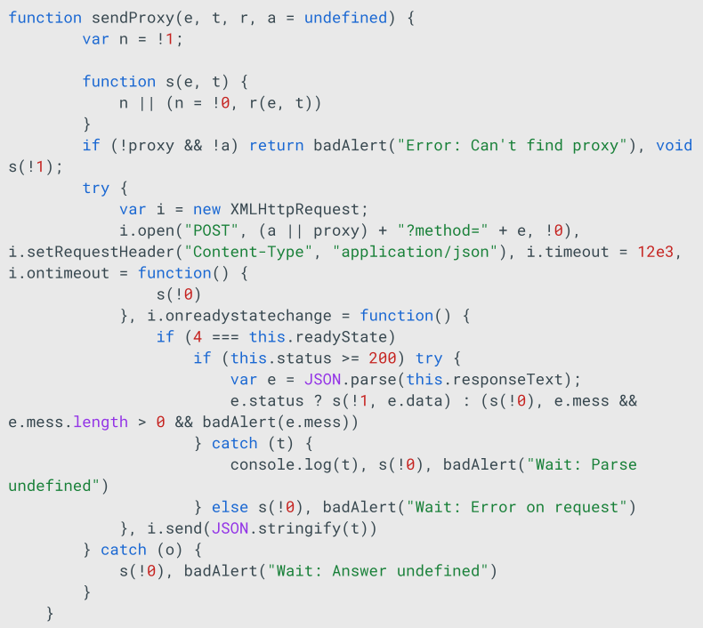 The proxy variable retrieved from the smart contract is then used by another function within the JS code named sendProxy.