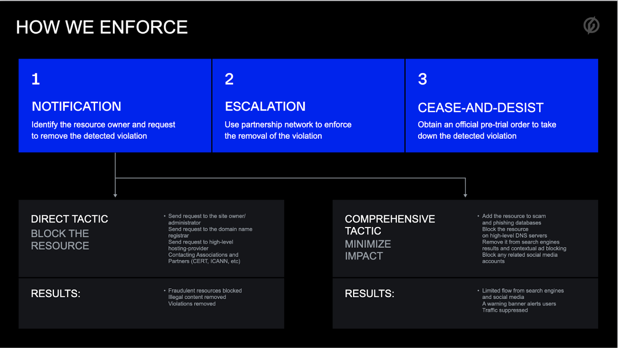 This intelligence feeds into our Digital Risk Protection platform, which analyzes the data and uses advanced algorithms to scan the internet for instances of trademark infringement, counterfeiting, and unauthorized use of brand assets. These tools enable brand owners to proactively and automatically identify and address potential threats, minimizing the impact of online brand abuse on their reputation and revenue.