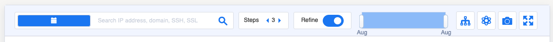 To start using the network graph, an IP address, an email address, or an SSL certificate fingerprint should be typed in the search bar. Analysts can regulate three parameters: the timeframe, the number of steps, and the refine option.
