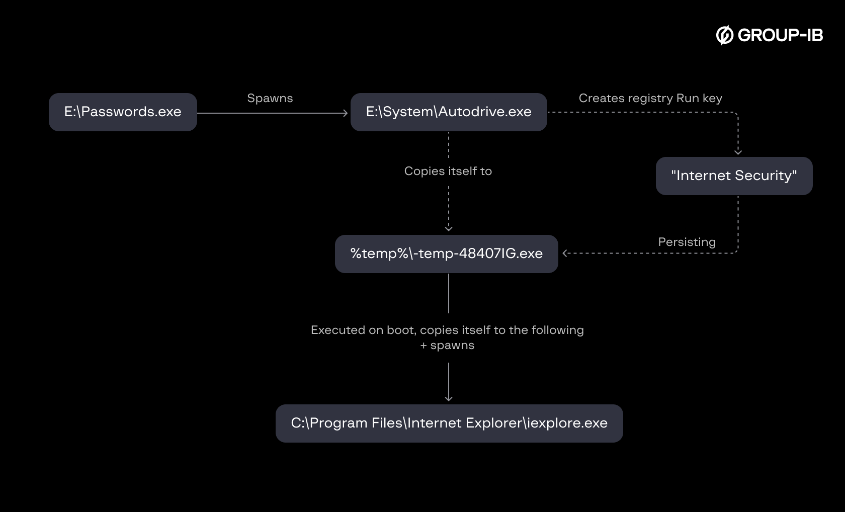 As the hashes were not present in the threat intelligence database, we collected and analyzed the specimens “AutoDrive.exe” and “Passwords.exe”. The specimens turned out to be malicious and capable of spreading via USB. They are also capable of writing to the Run registry key.