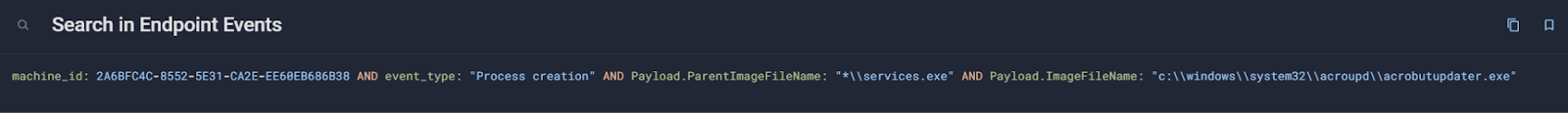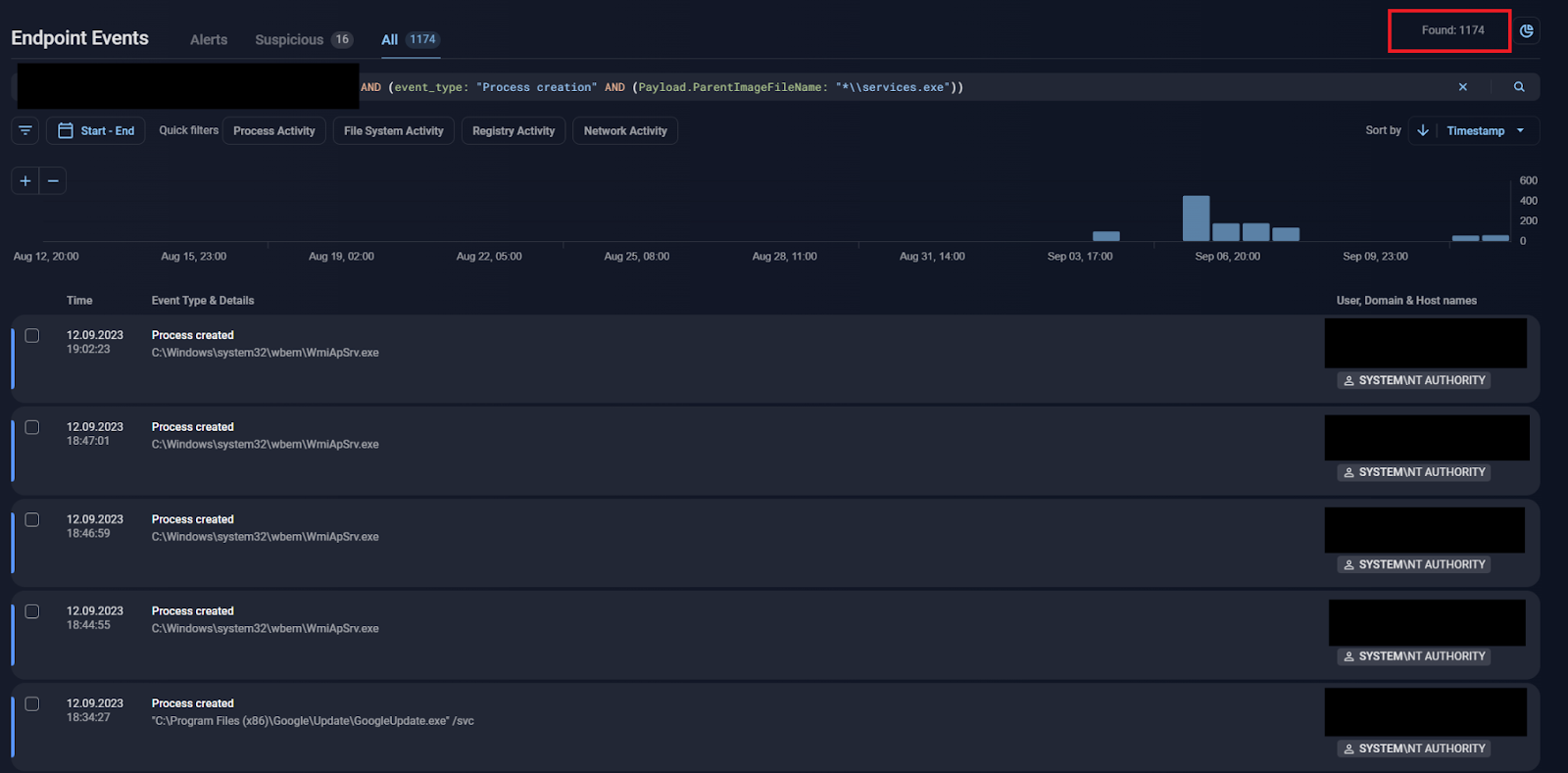Bingo! There is at least one suspicious-looking executable. So we can build a simple query to look for a process creation event related to this executable:
