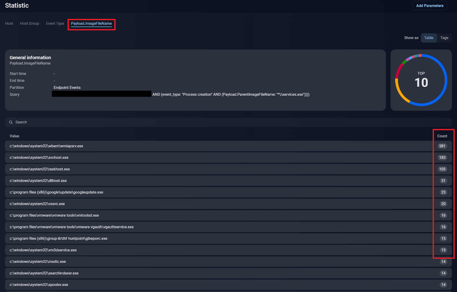 There are too many events matching this query — and almost all the events are legitimate. We need additional baselining to obtain the list of suspicious events. Unfortunately, a universal list of exclusions does not exist in this case because they all depend on the infrastructure (which is different for every network). We could process them one by one, but this would be time-consuming. In this case, we therefore have an additional analysis method at our disposal, namely to build statistics for matching events and perform quick baselining: