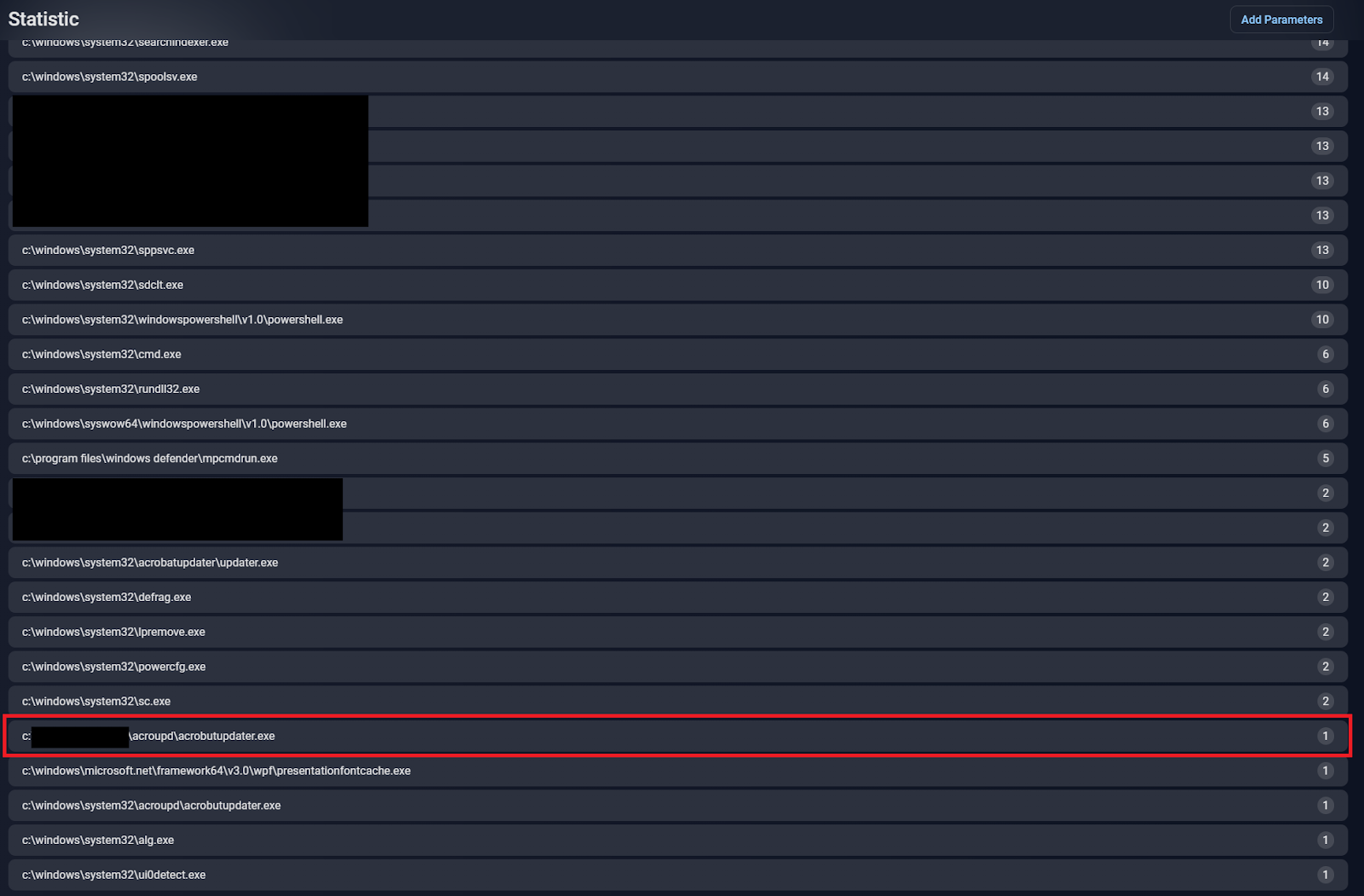 In this case, we simply count the number of occurrences of unique service executable files. The most interesting and most suspicious things are usually at the bottom of such a table, so let’s take a look