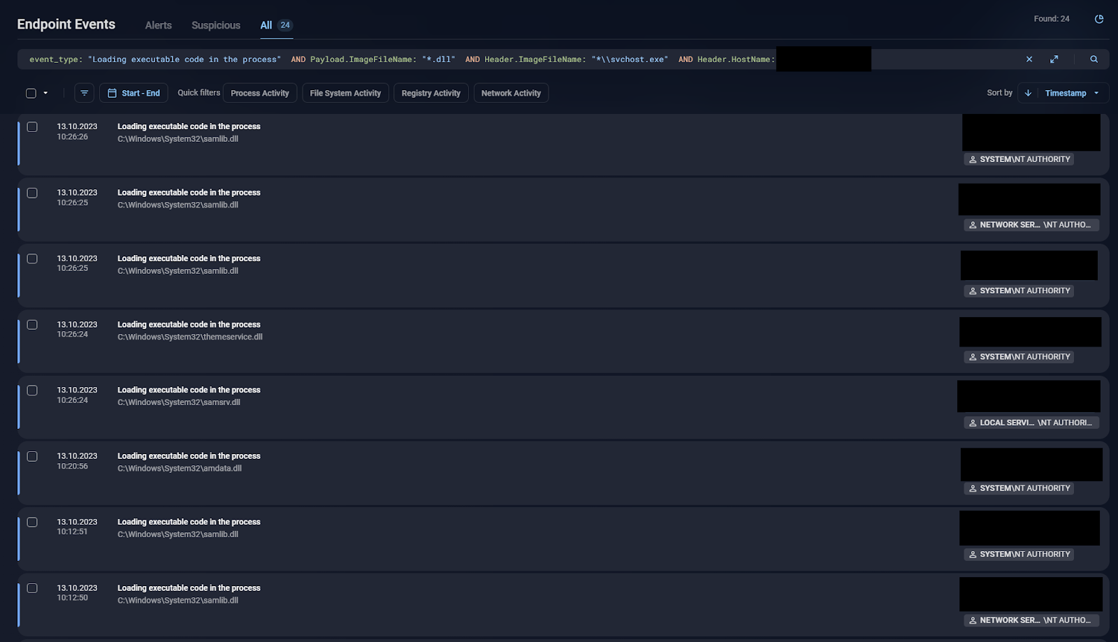Next, let’s focus on a case when a malicious service is executed as a .dll file. In such cases, the .dll file in question is loaded to the memory by the svchost.exe process. Bear in mind that there may be many svchost.exe processes running at the same time and there may be many .dll files loaded by each one, so it is a bit difficult to rely on process creation events. Luckily, we have a special event type for this case: Loading executable code in the process (or “DLL loading” for simplicity).