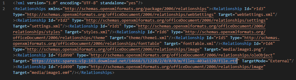 In /word/_rels/document.xml.rels, the malicious document contains a link to download a template: hxxps://cstc-spares-vip-163[.]dowmload[.]net/14668/1/1228/2/0/0/0/m/files-403a1120/file.rtf