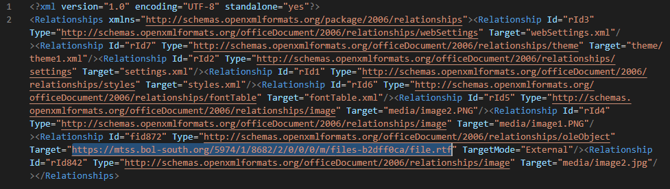 In /word/_rels/document.xml.rels, the malicious document contains a link to download a template: hxxps://mtss[.]bol-south[.]org/5974/1/8682/2/0/0/0/m/files-b2dff0ca/file.rtf