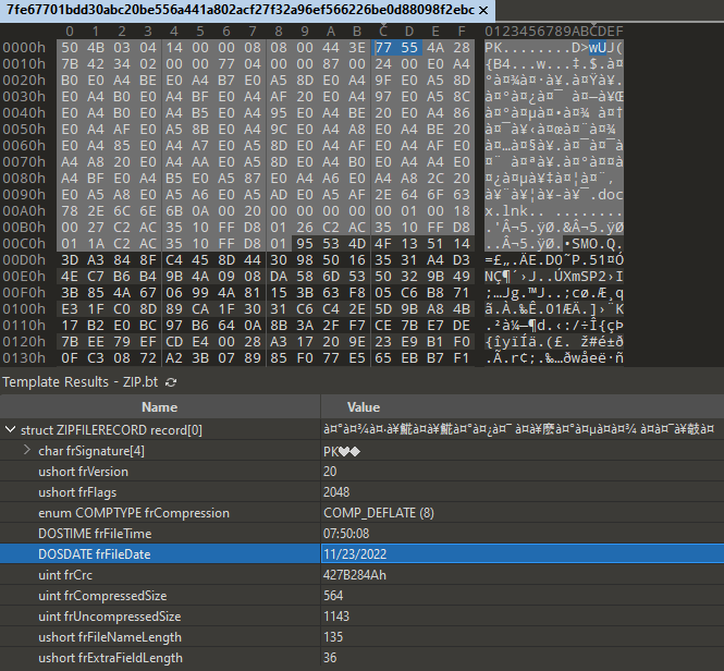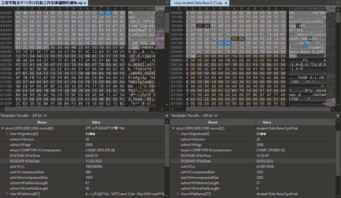 It is worth noting that the LNK file 公管学院关于11月22日起工作安排调整的通知.docx.lnk was added to the archive 公管学院关于11月22日起工作安排调整的通知.zip on November 22, 2022, while the LNK file student Data Base 8.pdf.lnk was added to the archive virus student Data Base 8 (1).zip on March 3, 2022.