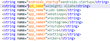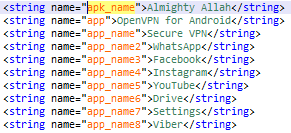 The matching apk_name value “Almighty Allah” in the applications’ string resources