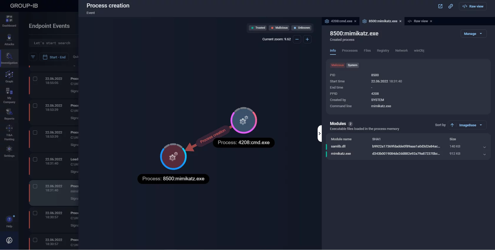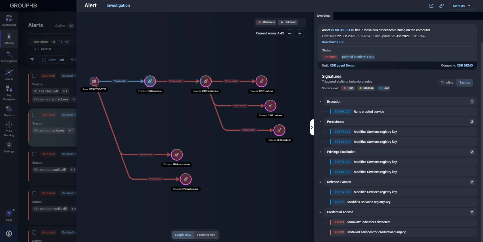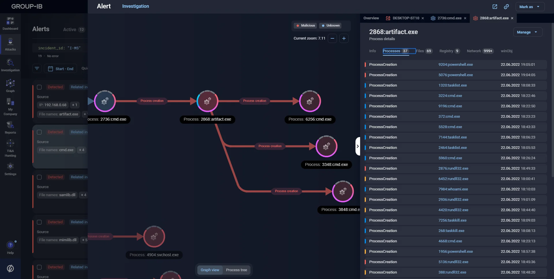 Group-IB’s MXDR not only detects such techniques being used both at the host and at the network level, but it also tracks every action taken by threat actors after they use the PtH.