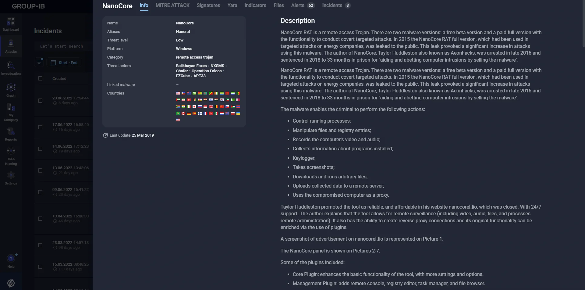 - When attributing threats to a malware family or specific threat actors, descriptions and timelines of the group’s attacks, all related indicators, information about vulnerabilities, and additional signatures become available in one click. You understand quickly and in detail who is attacking you and why.