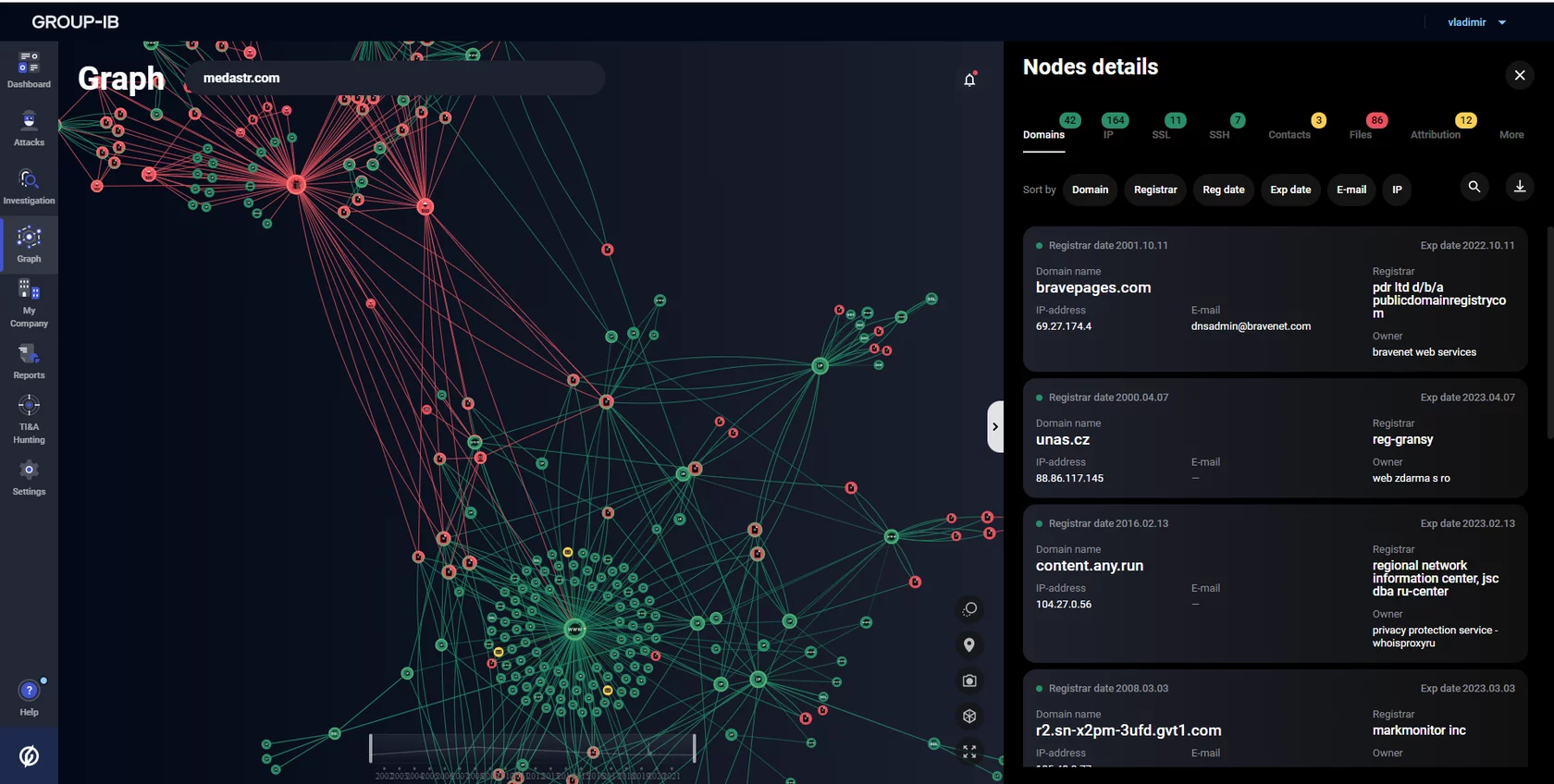 We provide all the necessary context in a single window: open ports, services, recognized software, related vulnerabilities, historical domain registration data, passive DNS, related malicious files, attribution to malware families, hacker aliases, and even mentions on hacker forums.