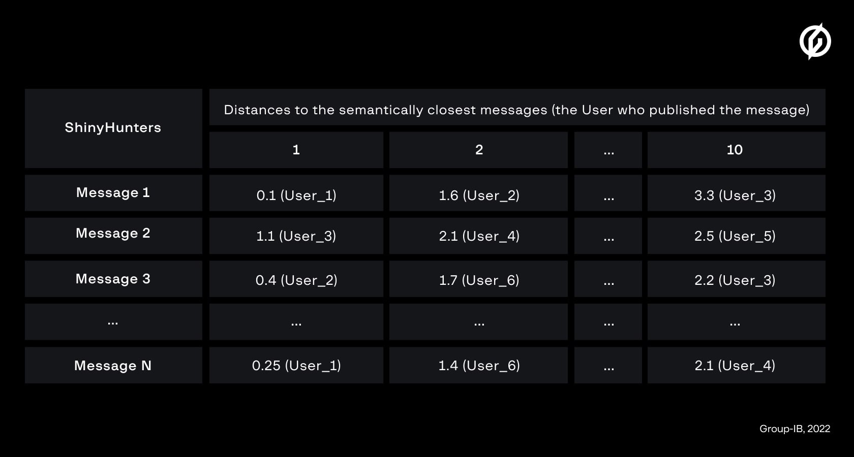 For further analysis, all message vectors (N) belonging to user ShinyHunters were selected. For each such vector, the top 10 nearest vectors of other users’ messages were found (by the Euclidean distance). As a result, we obtained a matrix of dimension N*10 (example of the matrix is in the table below), with the nicknames of published messages as well as its elements. Then we filtered out repeated messages and messages whose Euclidean distance exceeds the specified threshold. The threshold was calculated empirically by comparing the proximity of different messages.