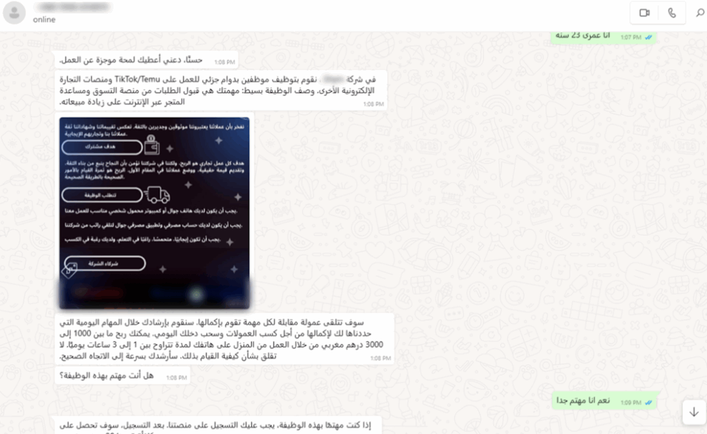 Once interest is generated, victims are funneled into direct contact with the scammer – usually via messaging apps – where the real data theft begins.
