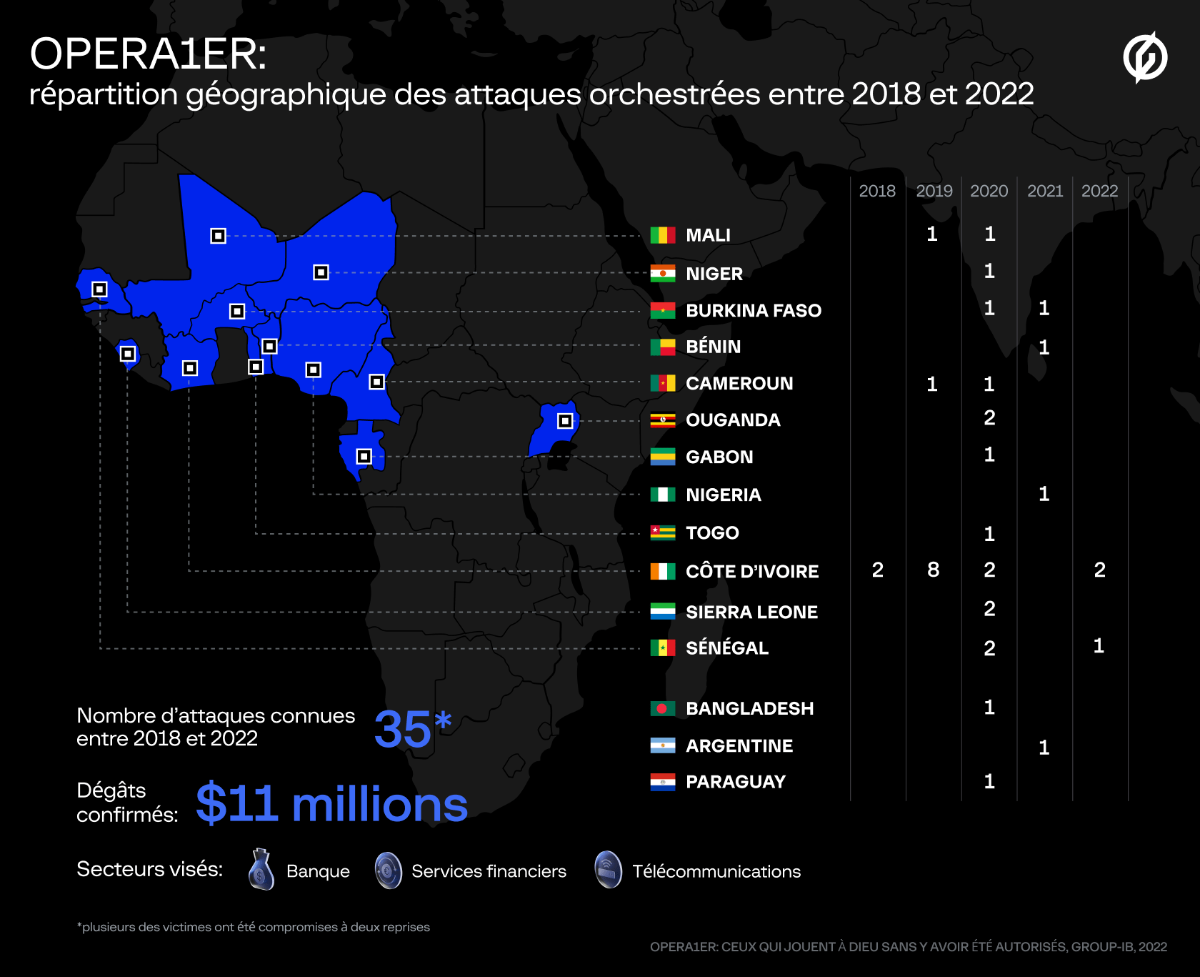 Actif et dangereux de 2018 à 2022, le gang francophone a réussi à mener plus de 30 attaques réussies contre des banques, services financiers et entreprises de télécommunications, principalement situés en Afrique. Il est confirmé qu’OPERA1ER a dérobé au moins 11 millions de dollars, selon Group-IB.