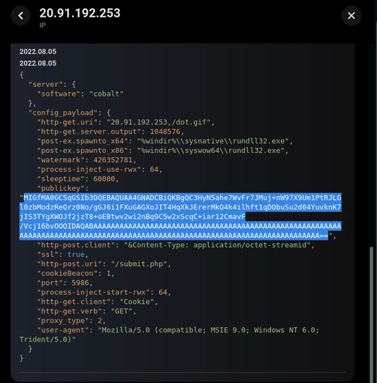 Tout d’abord, m. Skowron remarqua que l’attaquant utilisait une PublicKey spécifique sur ses serveurs Cobalt Strike : “PublicKey_MD5”: “52c66274994172447b21054744cc5b69”.