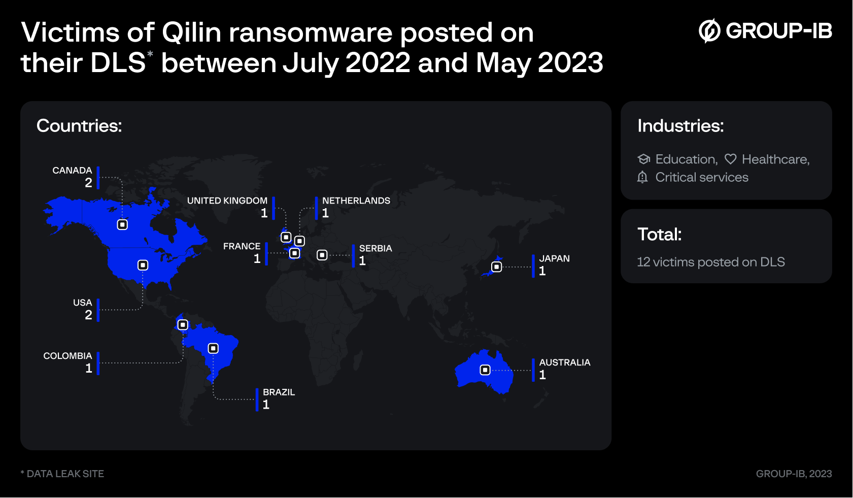 Qilin ransomware activities also include posting its victim’s data on the group’s DLS. When analyzed by Group-IB researchers in May 2023, Qilin’s DLS contained data from 12 companies, from the following countries: