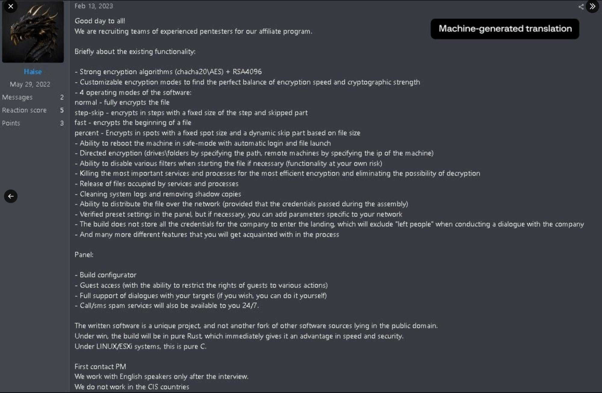 Group-IB’s threat analysts came across an original screenshot of a post by a “recruiter” from Qilin to hire affiliates and advertise their RaaS on an underground forum. The post is written in Russian and mentions that the group “does not work in CIS countries.”