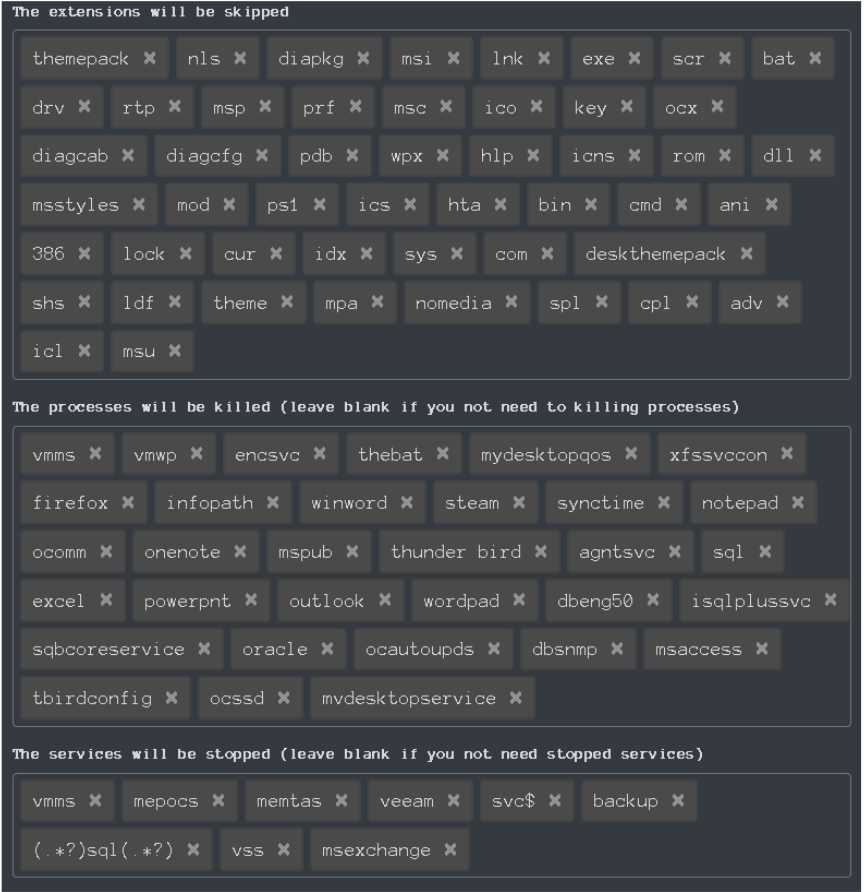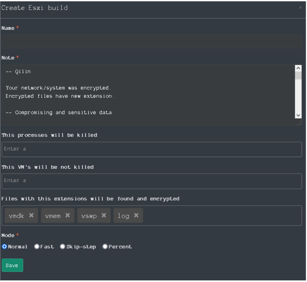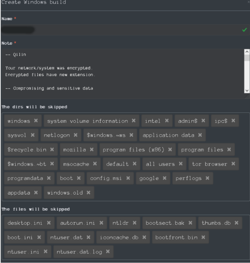 When an affiliate creates a target, they can configure a sample of Qilin ransomware using a builder. The following details can also be configured: