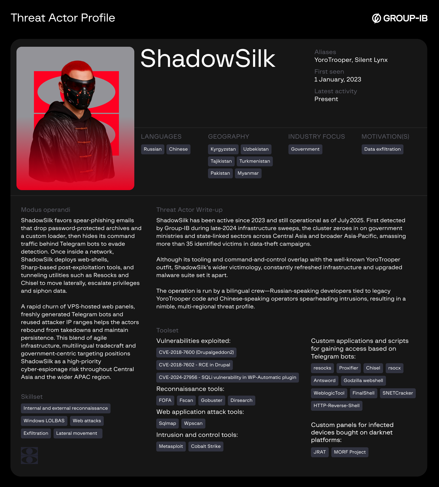 The toolset and infrastructural overlaps with previous campaigns carried out by a group known publicly as YoroTrooper. Part of this activity was discussed in January 2025 as “Silent Lynx,” which Group‑IB tracked and internally designated as ShadowSilk. Subsequent research showed a more nuanced profile and a larger‑than‑expected campaign with many previously unknown victims, leading Group‑IB to attribute the expanded activity to a threat cluster codenamed ShadowSilk. After the January disclosure of their activities, ShadowSilk abandoned much of its infrastructure. However, in June 2025 Group‑IB observed renewed activity and new infrastructure, identified additional government victims in Central Asia, and collected new IOCs.