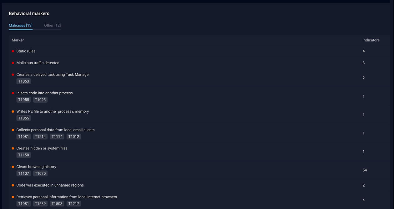 Group-IB’s native malware detonation capability allows us to record the different indicators of compromise that occur during malware execution. This data is aggregated in the reports that aim to give our clients a full picture of techniques for relevant families rather than just from one specific sample. Furthermore, the threat matrix can be enriched by our malware reverse engineers and incident responders manually to add more insight.