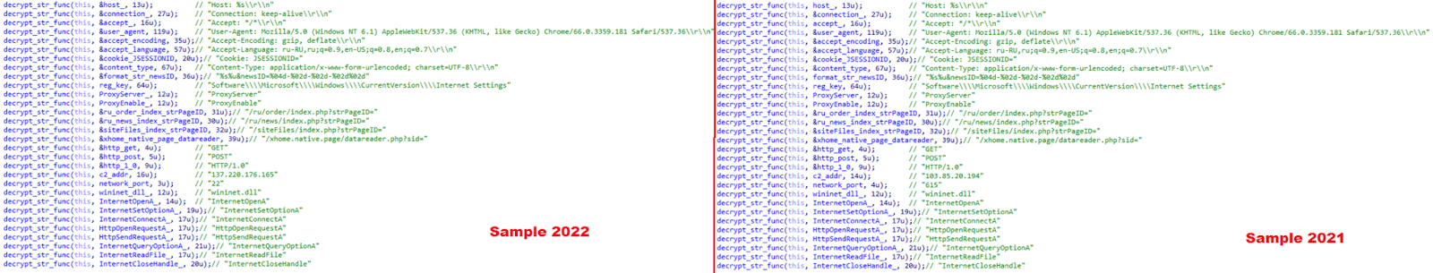 In addition, we compared the decrypted strings of the 2022 and 2021 samples. The different strings of the 2022 sample are marked in red, and the strings of the 2021 sample are highlighted in yellow. Below is the result of comparing the strings of the indicated Bisonal.DoubleT samples: