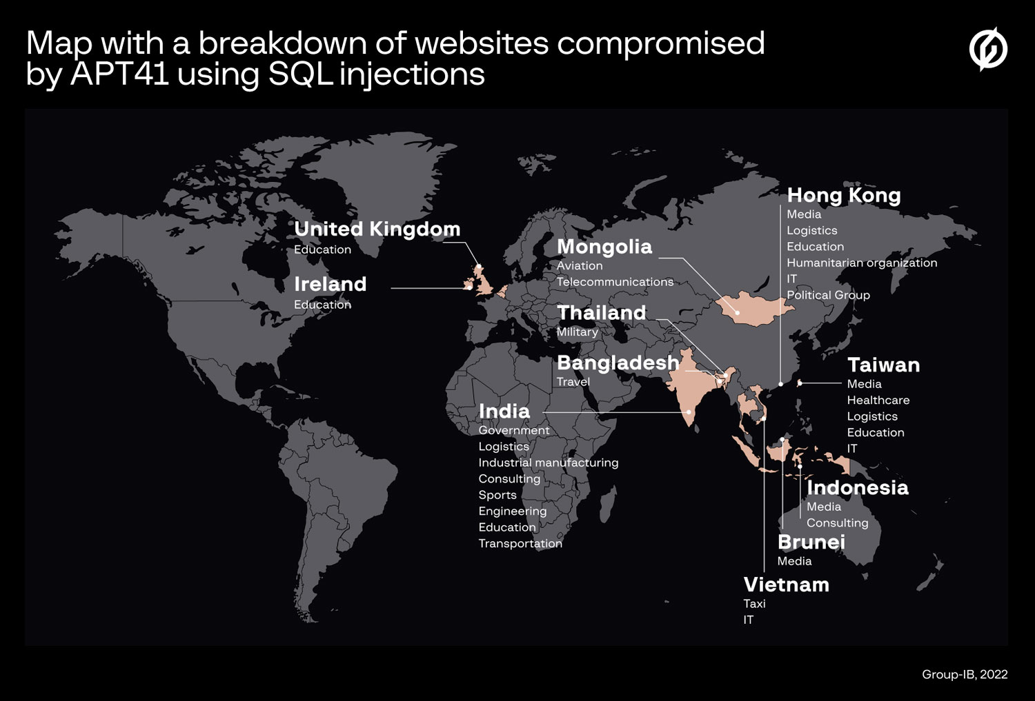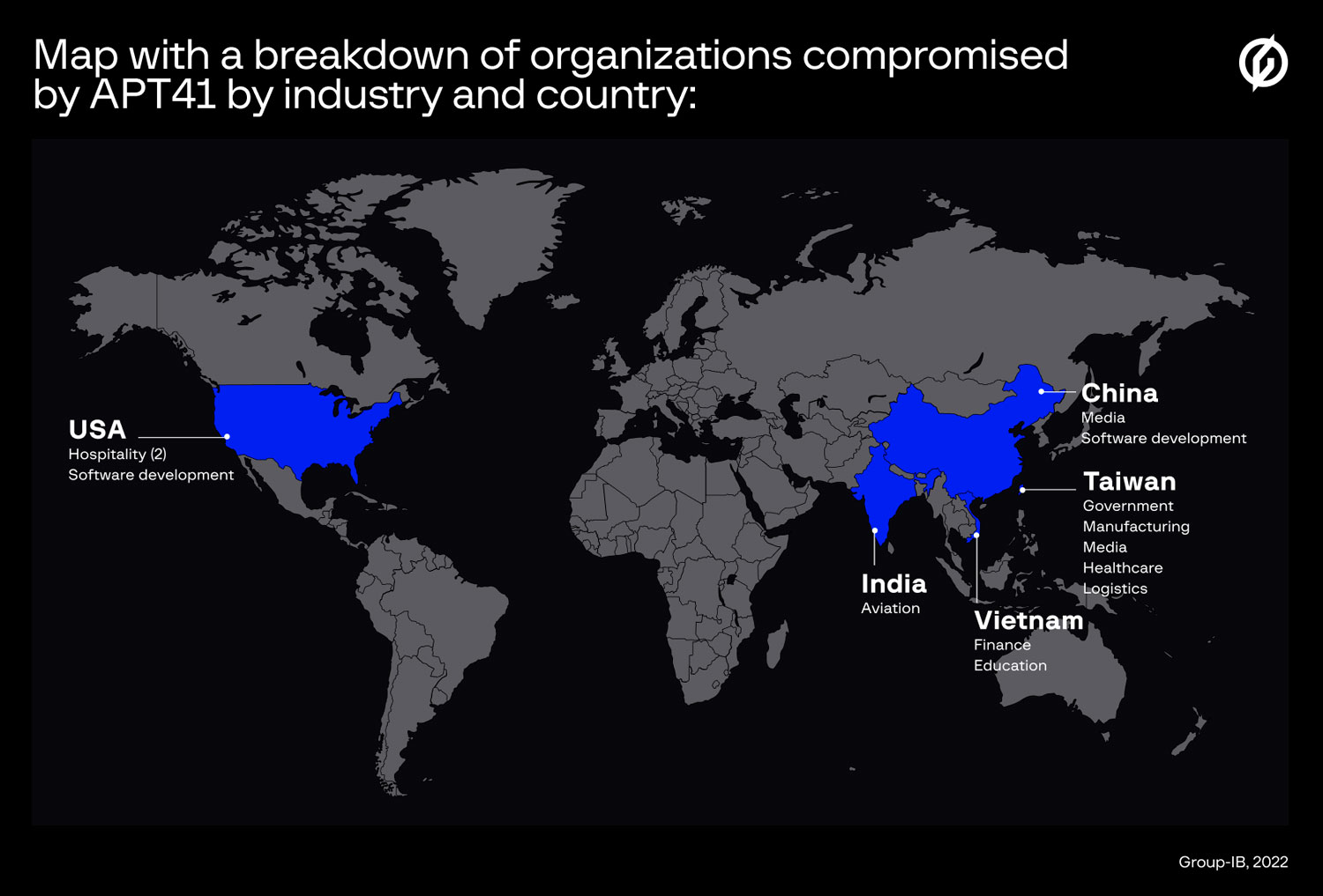 The state-sponsored hacker group APT41 (aka ARIUM, Winnti, LEAD, WICKED SPIDER, WICKED PANDA, Blackfly, Suckfly, Winnti Umbrella, Double Dragon), whose goals are cyber espionage and financial gain, has been active since at least 2007. Group-IB Threat Intelligence analysts identified four APT41 malware campaigns carried out in 2021 that were geographically spread across the United States, Taiwan, India, Vietnam, and China. The targeted industries included the public sector, manufacturing, healthcare, logistics, hospitality, education, as well as the media and aviation. According to Group-IB, there were 13 confirmed victims of APT41 in 2021, but the actual number could be much higher.