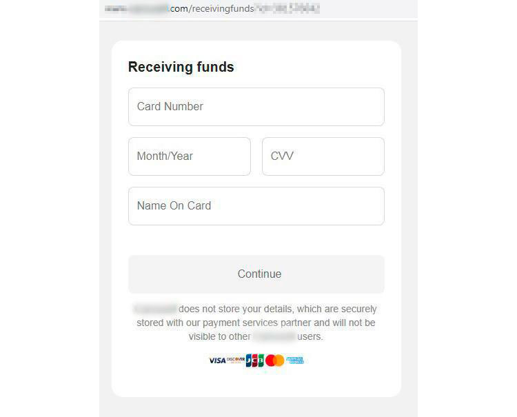After clicking “Receive funds”, the seller, the victim, in this case, would be redirected to a phishing page where their payment card credentials are retrieved.