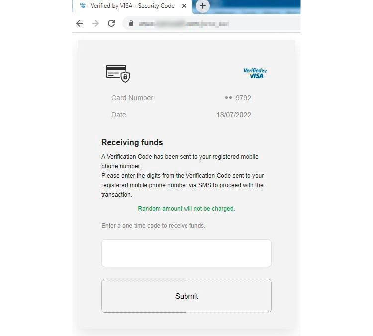 After the scammers receive credit card details from the victim, they request OTP verification from the bank. This again is a fake OTP page. Once the victim submits the OTP code on the fake website, the scammers can transfer money to their accounts.