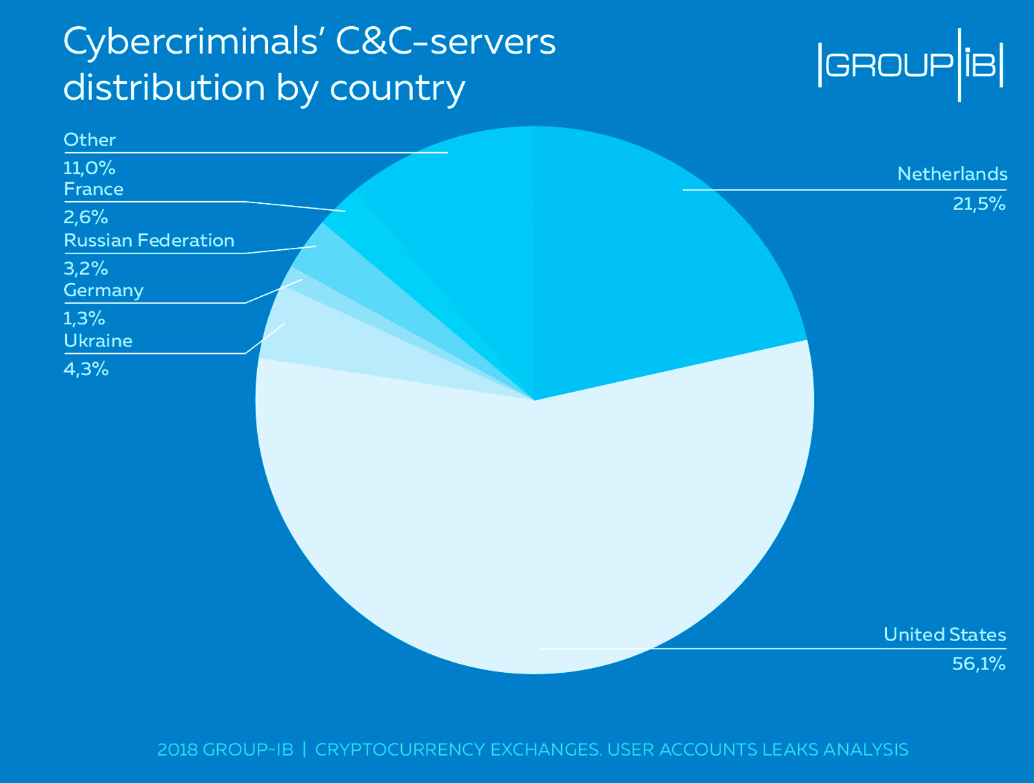 Experts of Group-IB have identified 50 active botnets used for launching cyberattacks on cryptocurrency exchanges users. The infrastructure used by cybercriminals is mainly based in the USA (56.1%), the Netherlands (21.5%), Ukraine (4.3%) and Russia (3.2%).