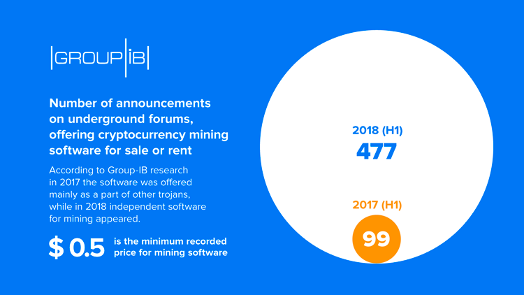Group-IB, an international company specializing in the prevention of cyberattacks, is recording new outbreaks of illegal mining (cryptojacking) threats in the networks of commercial and state organizations. According to Group-IB’s Threat Intelligence, over a year, the number of shadow-forum ads offering mining software has increased fivefold (H1 2018 vs H1 2017). Group-IB experts say it is a very dangerous tendency to have so many mining Trojans available designed to use other people’s devices and infrastructure for illegitimate generation of cryptocurrency.