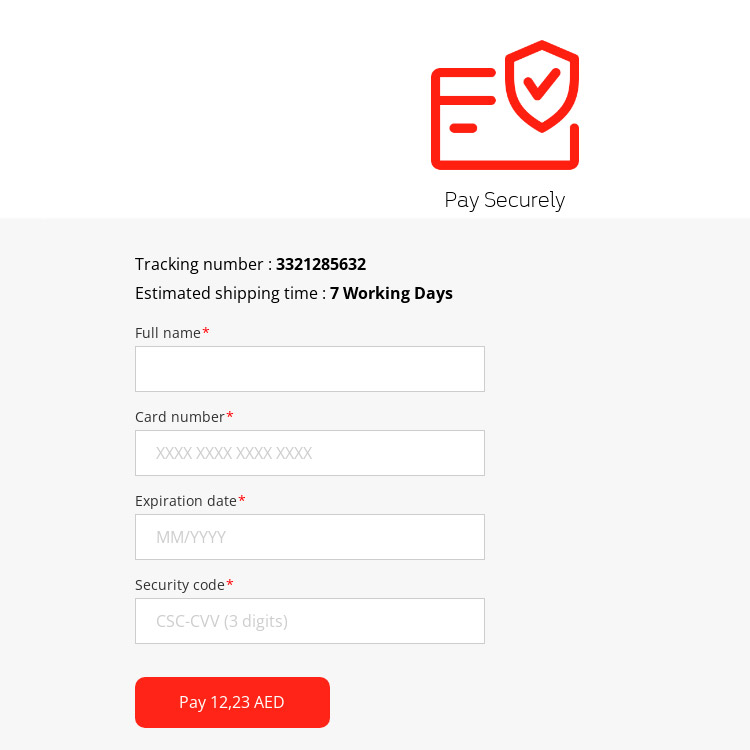 Additionally, these phishing templates are thoroughly localized: a user in the UAE would see their local postal brand and currency. For instance, on the screengrab of the phishing page below, the victim is required to transfer AED 12.23 (about $3.2). Whereas these cybercriminals would most likely attempt to pocket a bigger amount.