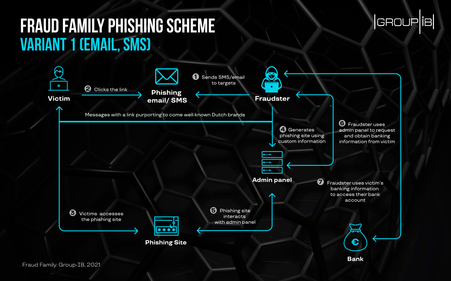 Having analyzed the technical infrastructure and phishing templates used in these fraudulent campaigns, Group-IB researchers uncovered a massive Fraud-as-a-Service operation. The cybercriminal syndicate behind it, which develops, sells and rents sophisticated phishing frameworks to other cybercriminals, targeting users mainly in the Netherlands and Belgium, was codenamed Fraud Family. These frameworks include phishing kits tools and resources used to steal information and web panels that allow cybercriminals to interact with the actual phishing site in real time and are used to collect and manage the stolen user data. The complete „plug and play„ phishing service keeps the framework under control and prevents it from leaking to the public.
