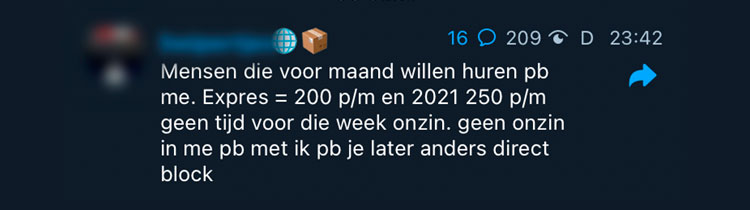 Group-IB’s cyber investigations experts found out that Fraud Family members actively use Telegram messenger to advertise their services to other less skilled fraudsters. These services included the sale of phishing tools or the rent of ready-to-use infrastructure that comes equipped with the phishing framework and anti-bot tools to prevent crawlers, automated analysis tools and services like VirusTotal and URLScan, and researchers from accessing the phishing sites. Any fraudster can rent the Express Panel for €200 per month or the Reliable Panel for €250.
