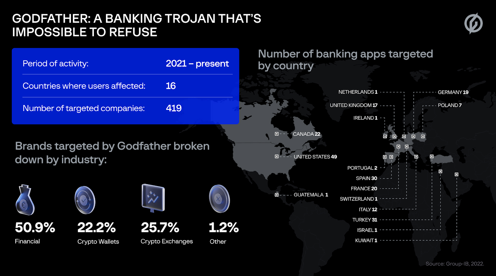 Group-IB, one of the global cybersecurity leaders, has today presented its findings about Godfather, an Android banking Trojan that is currently being utilized by cybercriminals to attack users of leading banking and crypto exchange applications in 16 countries. To date, Godfather has targeted the users of more than 400 applications thanks to its ability to generate convincing web fakes and overlay them on the screens of infected devices when a user tries to open a targeted application. With this scheme, the threat actors leveraging Godfather attempt to steal victims’ login credentials and bypass two-factor authentication in order to gain access to victims’ accounts and drain their funds. During their research into this new Android Trojan, Group-IB’s Threat Intelligence team discovered that Godfather is a successor of Anubis, a widely-used banking Trojan whose functionalities were limited by Android updates and the prior efforts of malware detection and prevention providers.