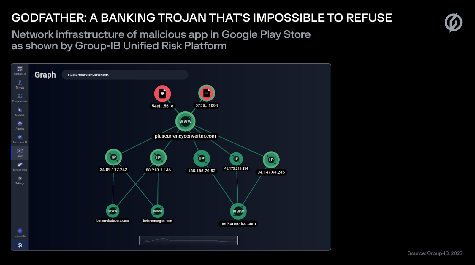 Above is a screenshot of Group-IB’s patented Graph Network Analysis tool, a feature of Group-IB’s intelligence-driven Unified Risk Platform, that shows links between the C&C addresses of Godfather and the downloaded application (below).