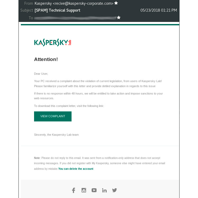 Again, the company’s experts rate the quality of phishing emails as high. For example, in the May 23 attack, the text in English is stylized as a “legal complaint”, the fake website kaspersky-corporate.com also has a high level of quality, which is not typical of Cobalt. These and other signs again pointed to the possibility that the remaining members of the Cobalt group were conducting a joint operation with other criminal groups, in particular, Anunak. Detailed information with technical indicators of the groups’ operation is provided in the report “Cobalt: Evolution and Joint Operations”.