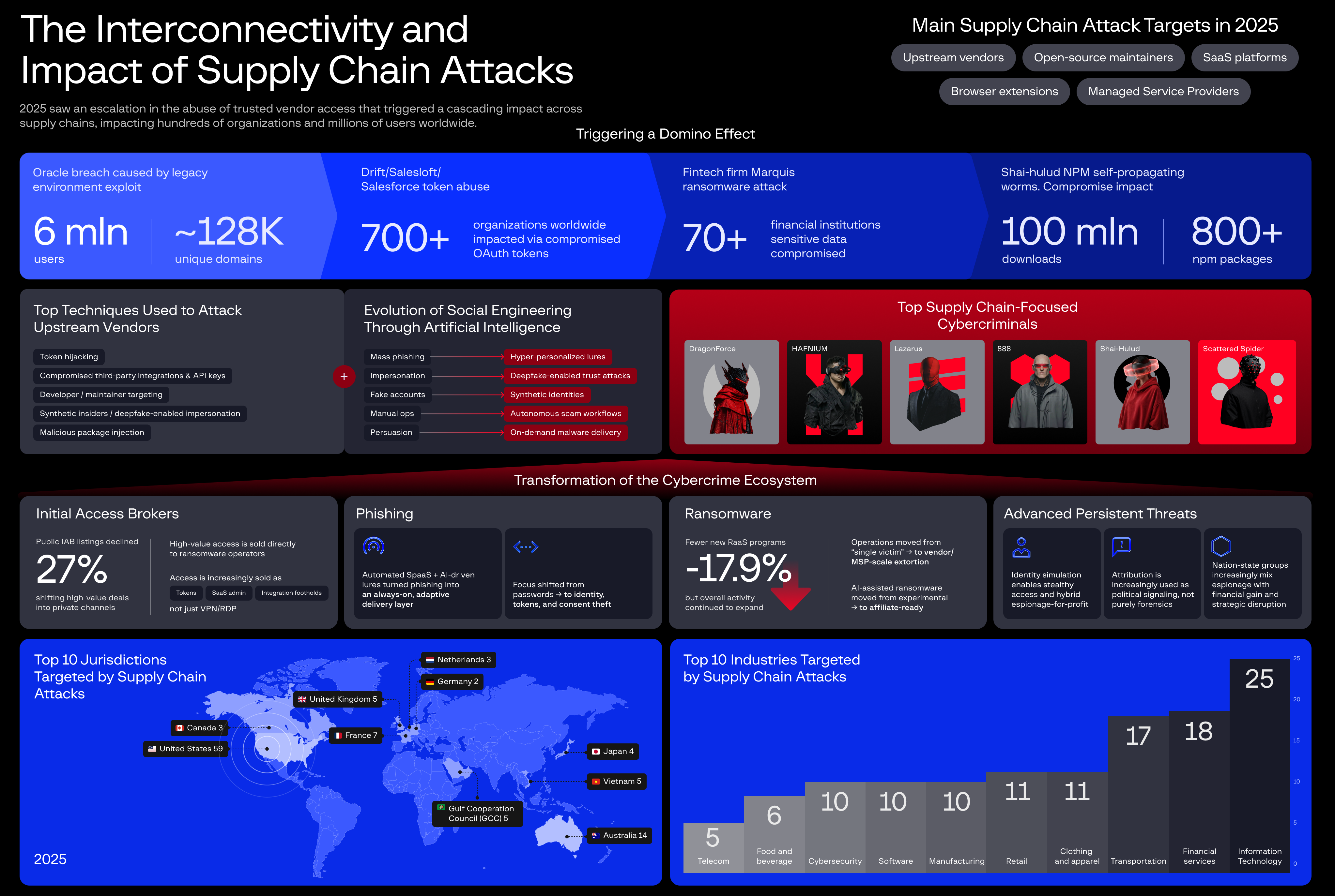 Drawing on worldwide telemetry alongside on-the-ground investigations, the report combines Group-IB’s adversary-centric and global analysis with real-world regional case studies to illustrate how supply chain compromises unfold across industries and geographies. These cases span open-source package poisoning, malicious browser extensions, OAuth token abuse, cascading SaaS breaches, and ransomware operations fueled by upstream access brokers — demonstrating how a single localized intrusion can rapidly escalate into large-scale, cross-border impact.