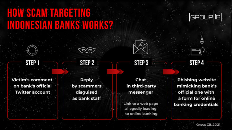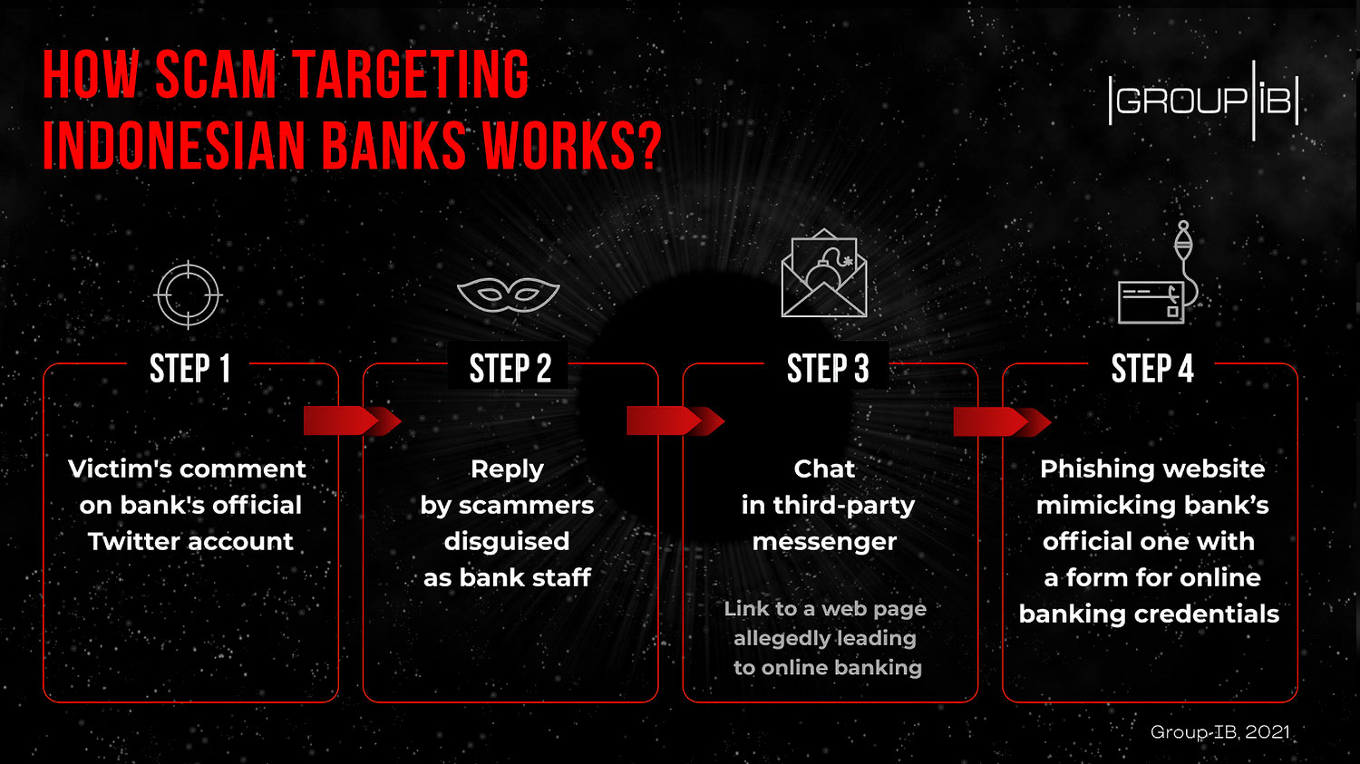 Group-IB Digital Risk Protection (DRP) analysts have found evidence of continuing offensive against at least seven large Indonesian financial institutions. The scam campaign targets over 2 million Indonesian bank customers, which corresponds to the number of legitimate bank Twitter pages’ followers. Upon discovery of this fraud, Group-IB has informed the banks impacted so that they take the necessary steps to remedy the situation.