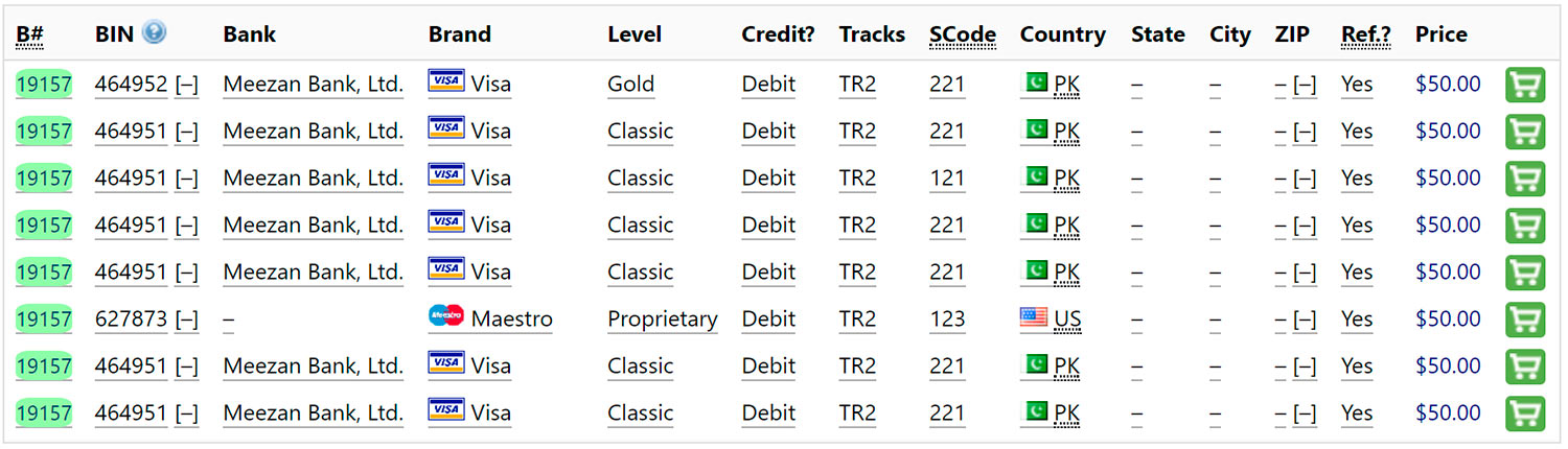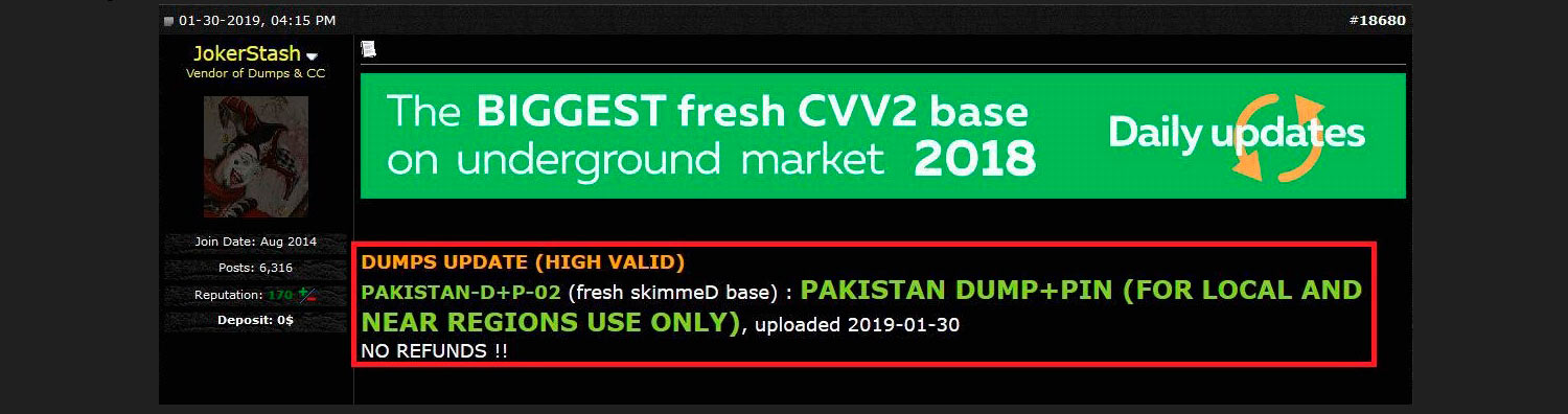 Group-IB Threat Intelligence team has discovered two new databases with tens of thousands of Pakistani banks’ cards that were releases on Joker’s Stash, one of the most popular underground hubs of stolen card data, at the end of January 2019. 96% of all card dumps, unauthorized digital copies of the information contained in magnetic stripe of a payment card, were related to a single bank — Meezan Bank Ltd. Pakistani banks’ cards are rarely sold on underground cardshops. This, and the fact that all the cards came on sale with PIN codes explains the high price, which was kept at 50 USD per card, while usually the price per card on dark web forums ranges from 10 to 40 USD.
